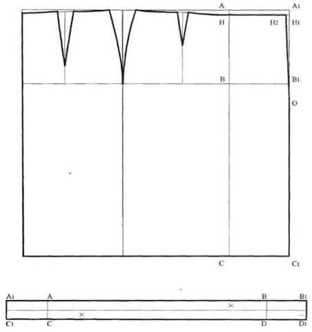 Проводим вертикальную линию и перпендикуляр к ней через точку О. ОА = ОА 1 = радиус = 1/2 обхвата талии /3,14/ (4/4). (Пример: 70 см/2/3,14/(4/4) = 11,15 см.) Дуга АА 1 = полуобхват талии. АВ = А1В1 = длина юбки (Ди ). (Пример: 50 см. Подробнее...