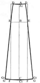 Построение задней половинки Строим прямой угол из точки А. АВ = высота линии бедер (В6). (Пример: 18 см.) АС = длина юбки (Ди ). (Пример: 60 см.) BE = 1/4 обхвата бедер (Об) - 1 см. (Пример: 96 см / 4 - 1 см = 23 см.) AD = BE = CF. Подробнее...